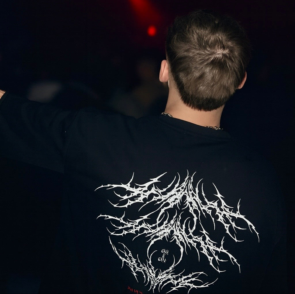 This heavyweight, stone-washed tee embodies the raw edge of ØREØN — torn hems, fractured symmetry, and blackened printwork that fades into chaos.